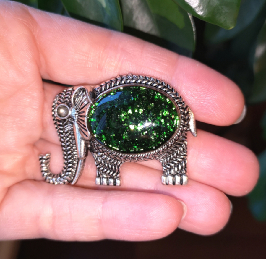 Elephant broche verre fondu aventurine verte